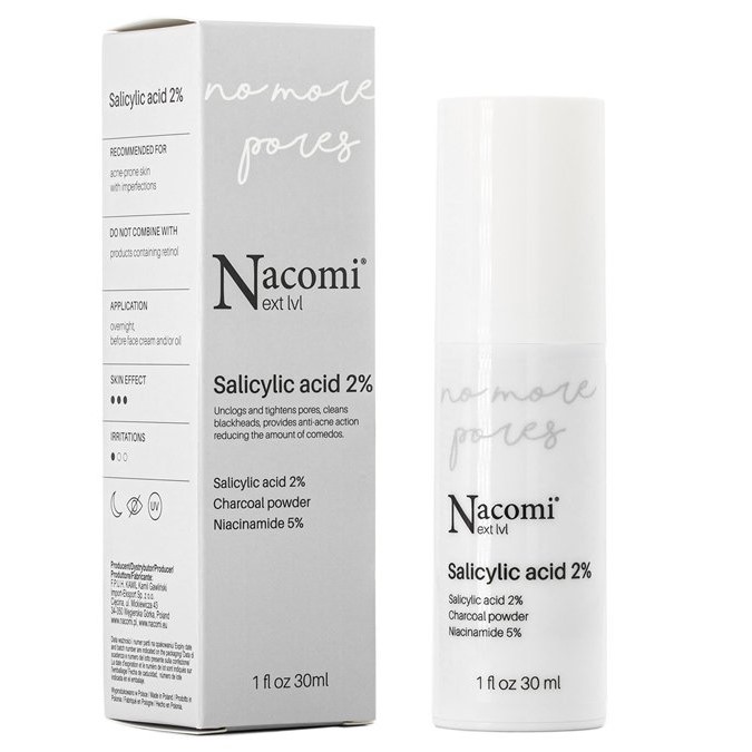 A Nacomi szérumban szalicilsavat is találhatsz. Ez a zselés szérum szalicilsavat tartalmaz megfelelő koncentrációban, a kozmetikumokban ez maximum – 2%, aminek köszönhetően erős gyulladáscsökkentő és antibakteriális hatása van. A BHA mellett a szérum niacinamidot is tartalmaz, amely világosítja az elszíneződéseket, és aktív szenet, amely felszívja a felesleges faggyút. Emiatt a szérum fekete színű, de eloszlatás után sokkal kevésbé intenzív a hatás. Mondhatnám, hogy enyhén szürkés színű, de emiatt nem kell aggódnunk – elvégre esti ápolásban használjuk a szalicilsavas szérumot.