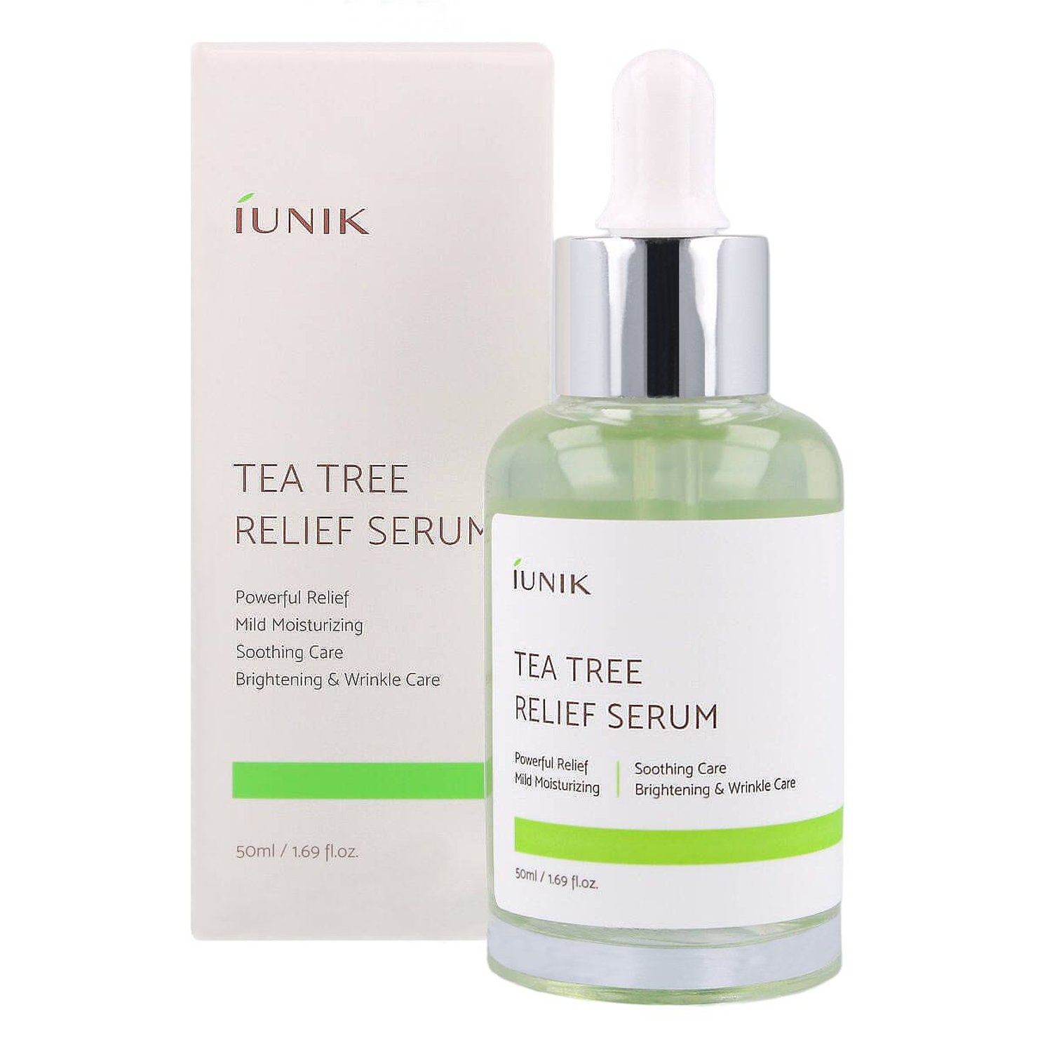 iUNIK - Tea Tree Relief Serum - egy arcszérum pattanásos bőrre. Teafa vizet tartalmaz, amely gyulladáscsökkentő és antibakteriális tulajdonságokkal rendelkezik. A szérum tartalmaz továbbá ázsiai gázló kivonatot, amely felgyorsítja a sebgyógyulást és hidratál, valamint niacinamidot, amely szabályozza a faggyútermelést és világosítja a hiperpigmentációt. A termék illatanyagmentes.