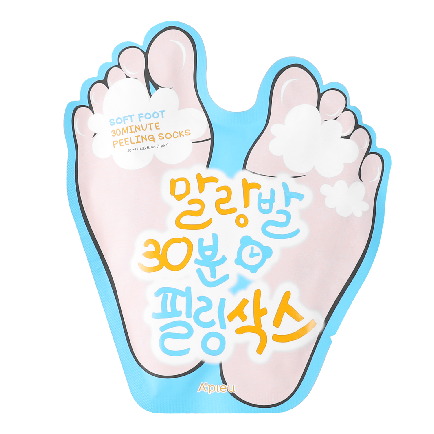 A'pieu - Soft Foot Peeling Socks - hámlasztó lábmaszk zokni formájában. Tejsavat és glikolsavat tartalmaz, amelyek hámlasztják a keratinizált epidermiszt és serkentik a bőrregenerációs folyamatokat. A karbamid hidratáló és hámlasztó hatású, míg a citromkivonat hidratál és antioxidáns hatású. A narancskivonat gondoskodik a lábbőr simításáról és puhításáról. A termék hatékonyan csökkenti a megvastagodott bőrt és simítja a lábbőrt.