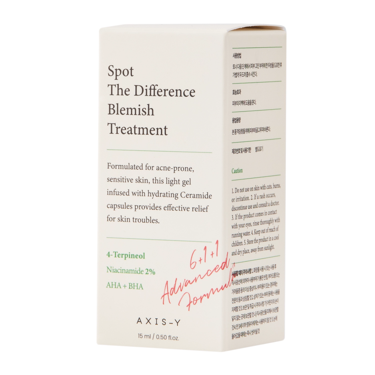 Axis-y - Spot the Difference Blemish Treatment - tökéletlenségek elleni arcszérum. Antibakteriális, nyugtató és gyulladáscsökkentő hatású összetevőket tartalmaz. Géles állagú, amelyet regeneráló ceramidokkal ás teafaolajjal gazdagították, amely akneellenes tulajdonságairól ismert. A niacinamid 2%-os koncentrációban gyulladáscsökkentő hatású, és világosítja a gyulladásutáni foltokat. Az AHA és BHA savak (glikolsav és szalicilsav) kombinációja támogatja a pattanások csökkentését. Számos növényi kivonat, köztük a zöld teából, nyugtató és szabályozó hatású. A termék extra hidratáló anyagokat tartalmaz, amelyek gondoskodnak a bőr védőgátjáról. Használható a tökéletlenségekre hajlamos, érzékeny bőrre. Natúr termék.