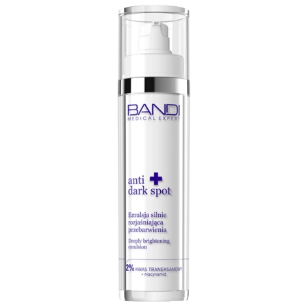 Bandi - Anti Dark Spot - tranexaminsavval készült arcápoló emulzió, amely hatékonyan világosítja a hiperpigmentációt és megakadályozza az újak kialakulását. A készítmény helyreállító szkvalánt és niacinamidot is tartalmaz, hogy fokozza a világosító hatást és szabályozza a faggyúkiválasztást. A panthenol hozzáadása elősegíti a bőr regenerálódását.
