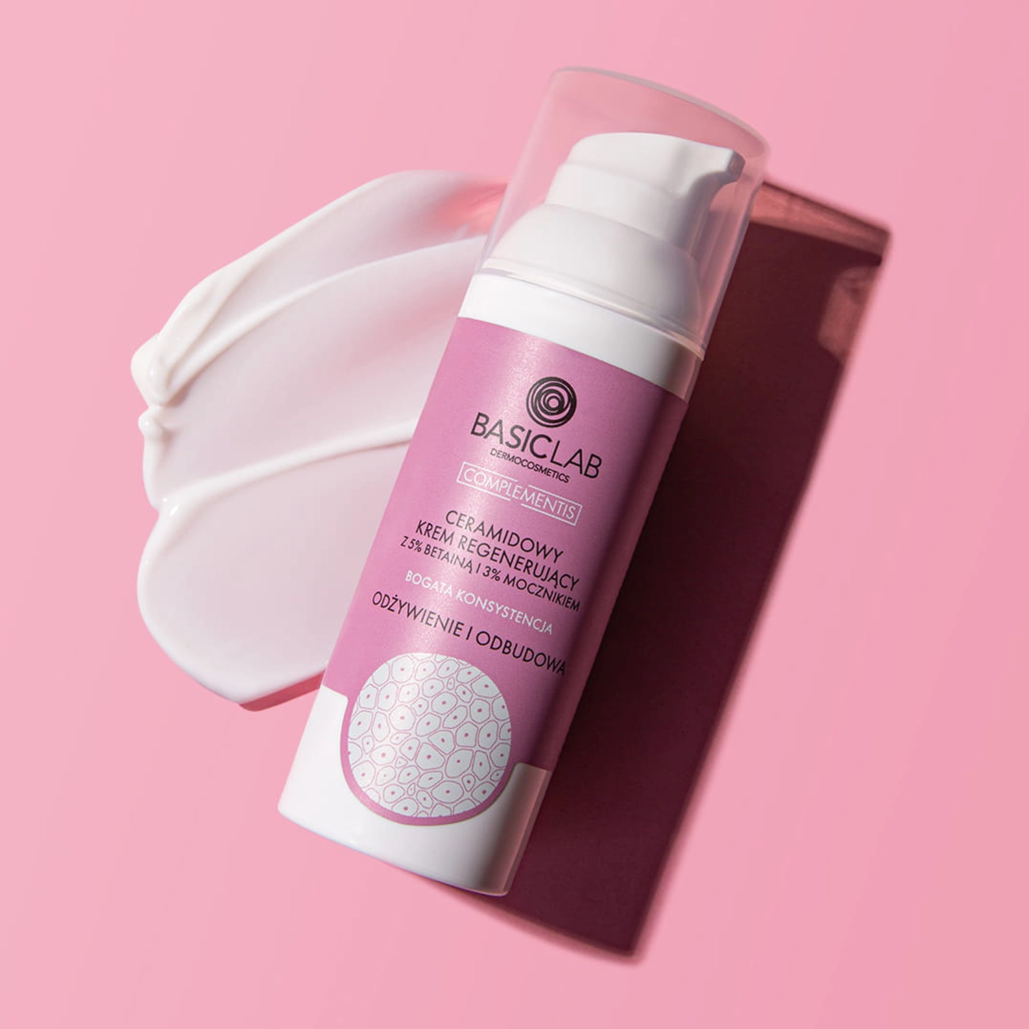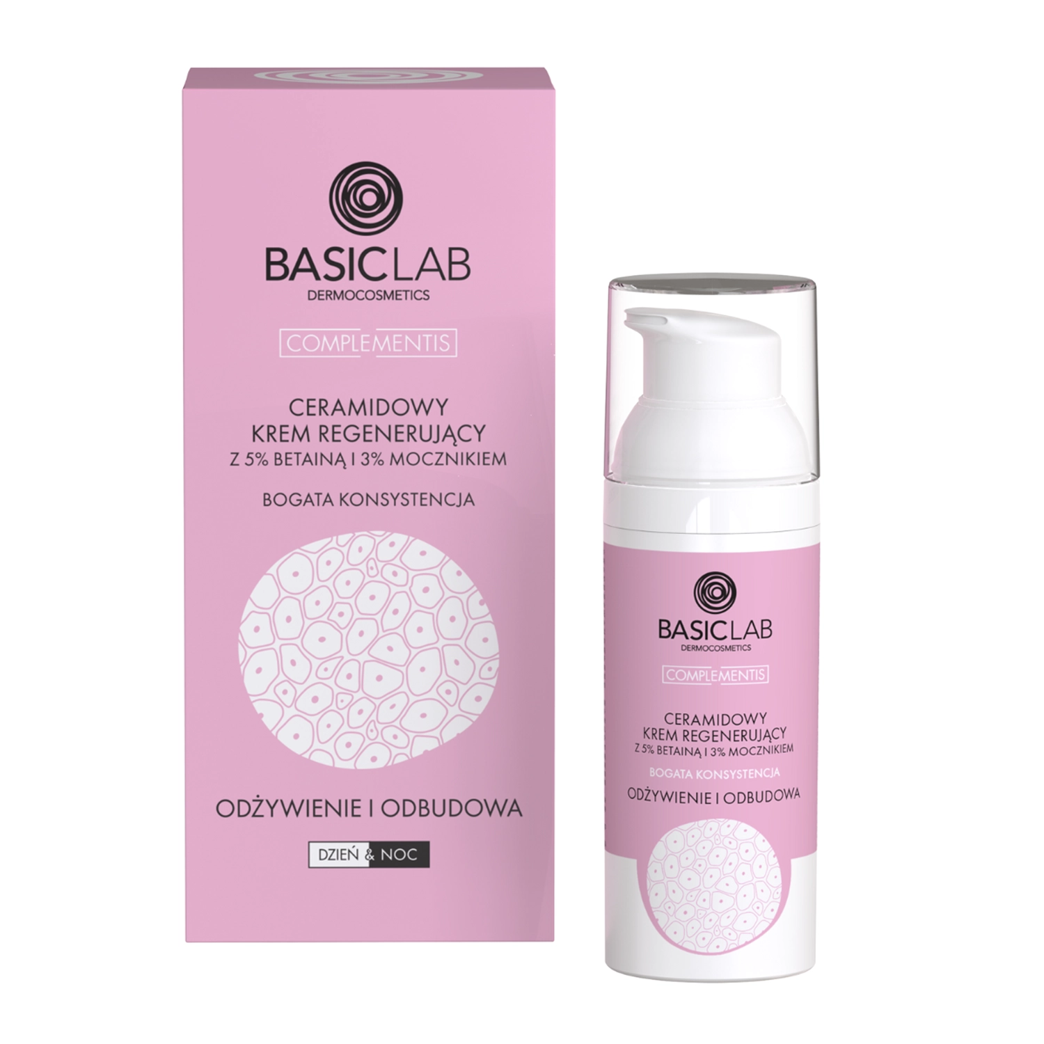 BasicLab - Complementis - Regeneráló Ceramid Krém Betainnal és Karbamiddal - Mindennapi használatra, reggeli és esti ápoláshoz, biztosítja a hidrolipid gát megfelelő működését. Mélyen táplálja és hidratálja a bőrt ceramid tartalmának köszönhetően, amelyek erősítik és regenerálják a bőr védőgátját. A 3% karbamid és 5% betain intenzív táplálást és hidratálást biztosít. A fitoszfingozin viszont csökkenti a bőrpírt, csillapítja a gyulladást és a bőrirritációt. A koleszterin erősíti a hidrolipid gátat, a trehalóz pedig megköti a vizet a bőrben, aminek köszönhetően fenntartja a hidratáltságot. A shea vaj intenzíven puhítja és védi a bőrt a kiszáradástól. A krém gazdag formulája védőréteget hagy a bőrön. Szoptató és terhes nők, valamint 3 éves kortól gyermekek számára is használható.
