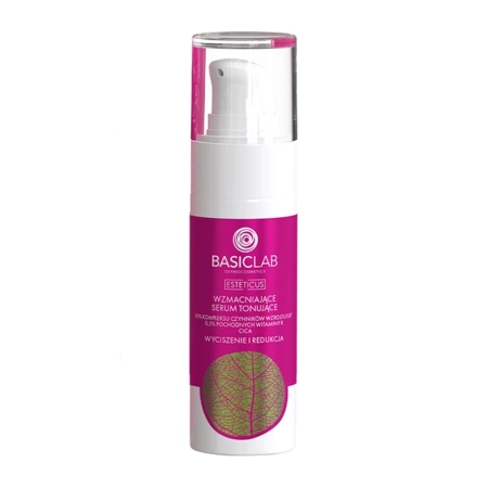 BasicLab - Esteticus - Erősítő és Bőrkiegyenlítő Szérum Hajszáleres és Érzékeny Bőrre 10% EGF Növekedési Faktor-komplexszel, 0,5% K-vitamin származékkal és CICA-val - egy szérum, amely csökkenti a bőrpírt és javítja az érzékeny bőr állapotát. A termék alapját egy 10% EGF növekedési faktor komplex képezi, amely erőteljes bőrnyugtató és gyulladáscsökkentő tulajdonságokkal rendelkezik. Az 0,5% K-vitamin-származékkal együtt segít támogatni a hajszálerek állapotát és csökkenti azok láthatóságát. A Centella Asiatica kivonat, az asiaticoside és a madecassoside, valamint egy peptid hozzáadásának köszönhetően a termék már az első alkalmazástól kezdve hatékonyan csökkenti a bőrpír megjelenését, hidratál és támogatja a védőgátat. A szérum emulzív állagú, látható zöld kapszulákkal, amelyek egy pigmentnek köszönhetően korrigálják a bőrpírt, valamint egy hűsítő komplexszel, amely nyugtatja a bőrt és helyreállítja a komfortérzetét. A termék vegánbarát, higiénikus pumpás csomagolásba van zárva.
