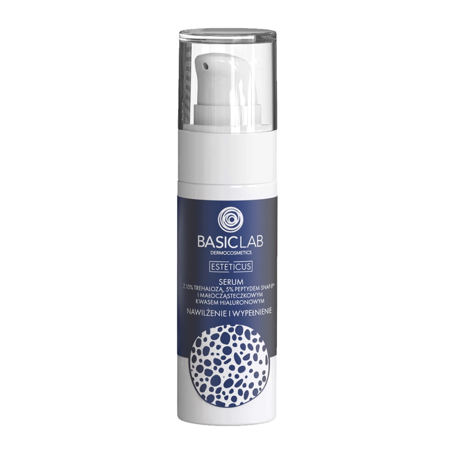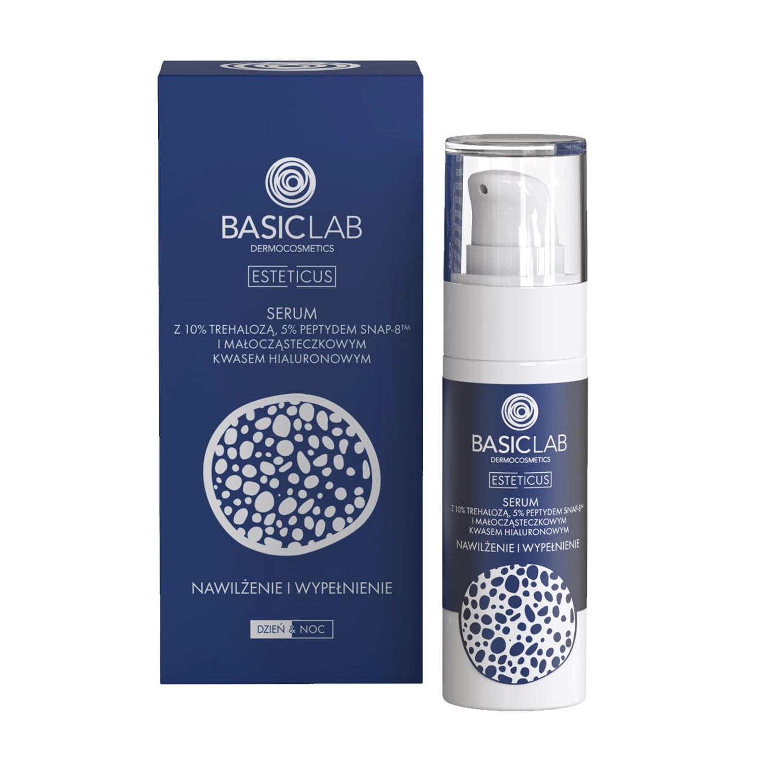 BasicLab - Esteticus - Szérum 10% trehalózzal, 5% SNAP-8 peptiddel és kismolekulájú hialuronsavval - hidratáló és ránctalanító tulajdonságokkal rendelkező szérum. 10% trehalózt tartalmaz, amely megtartja a vizet a felhámban, 5% SNAP-8 neuropeptidet, amely csökkenti az arc ráncait és rugalmasabbá teszi a bőrt, valamint 2 formájú hialuronsavat, amely hidratáló hatású. A szérumban többek között regeneráló skvalán, amely enyhíti az irritációt és erős antioxidáns, niacinamide, amely megakadályozza az elszíneződések kialakulását és szabályozza a faggyúmirigyeket, valamint urea, amely puhítja és hidratálja a bőrt található.