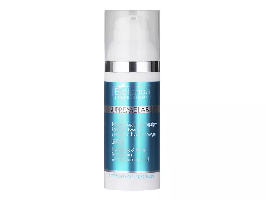 Bielenda Professional - Supremelab Hydra-Hyal Injection - Hydrating&Lifting Face Cream with Hyaluronic Acid SPF15 - érett, száraz, dehidratált bőrre ajánlott krém. Kakaóvajat, kókusz- és avokádóolajat tartalmaz, amelyek megakadályozzák a vízveszteséget, táplálják a bőrt és védik a külső tényezők ellen. A kémiai szűrők jelenléte véd az UV-sugárzás ellen. A nátrium-hialuronát és a hialuronsav erős hidratáló hatással rendelkeznek azáltal, hogy megkötnek a vizet a felhámban. A hidrolizált glikozaminoglikánok hozzáadása lágyító, hidratáló hatású, kisimítja a finom ráncokat és növeli a bőr rugalmasságát, míg az argirelin ránctalanító hatású.