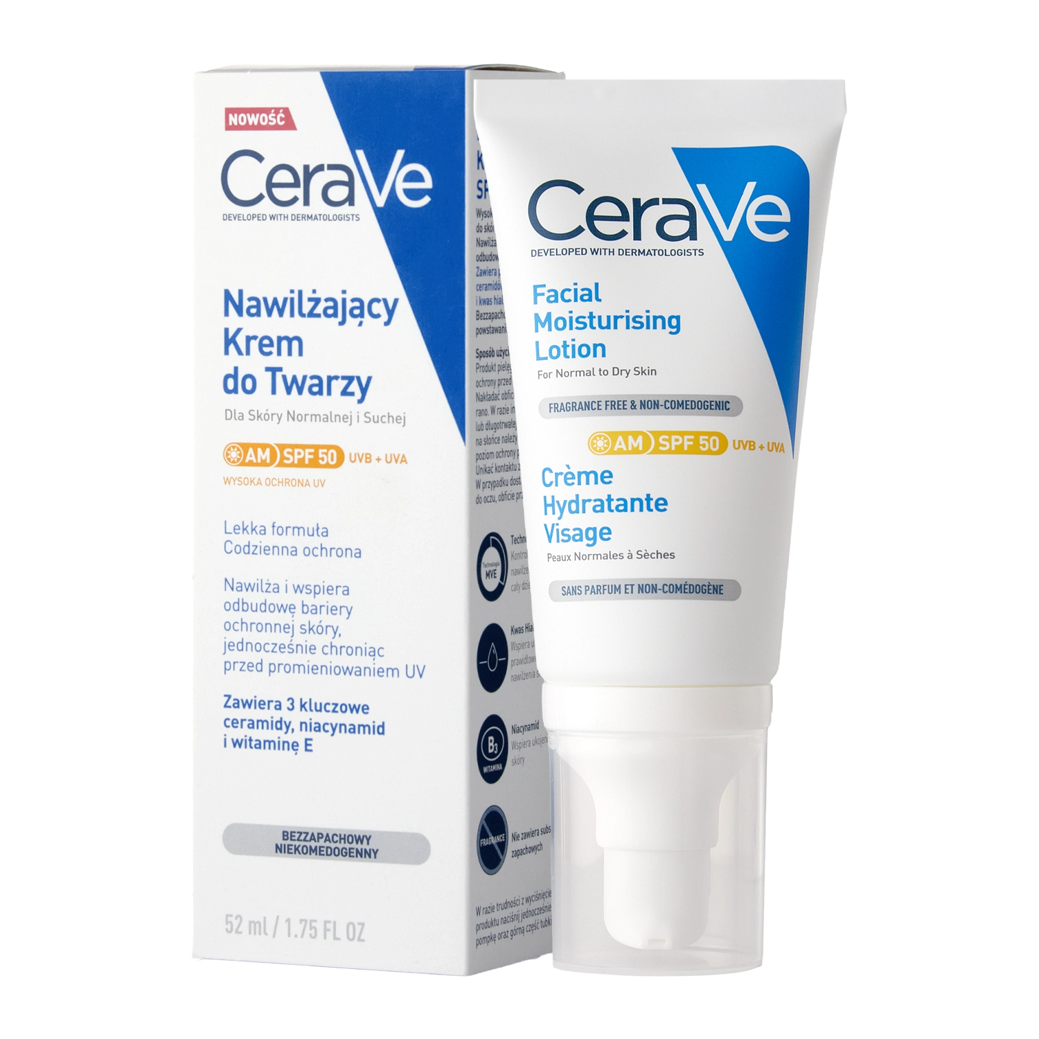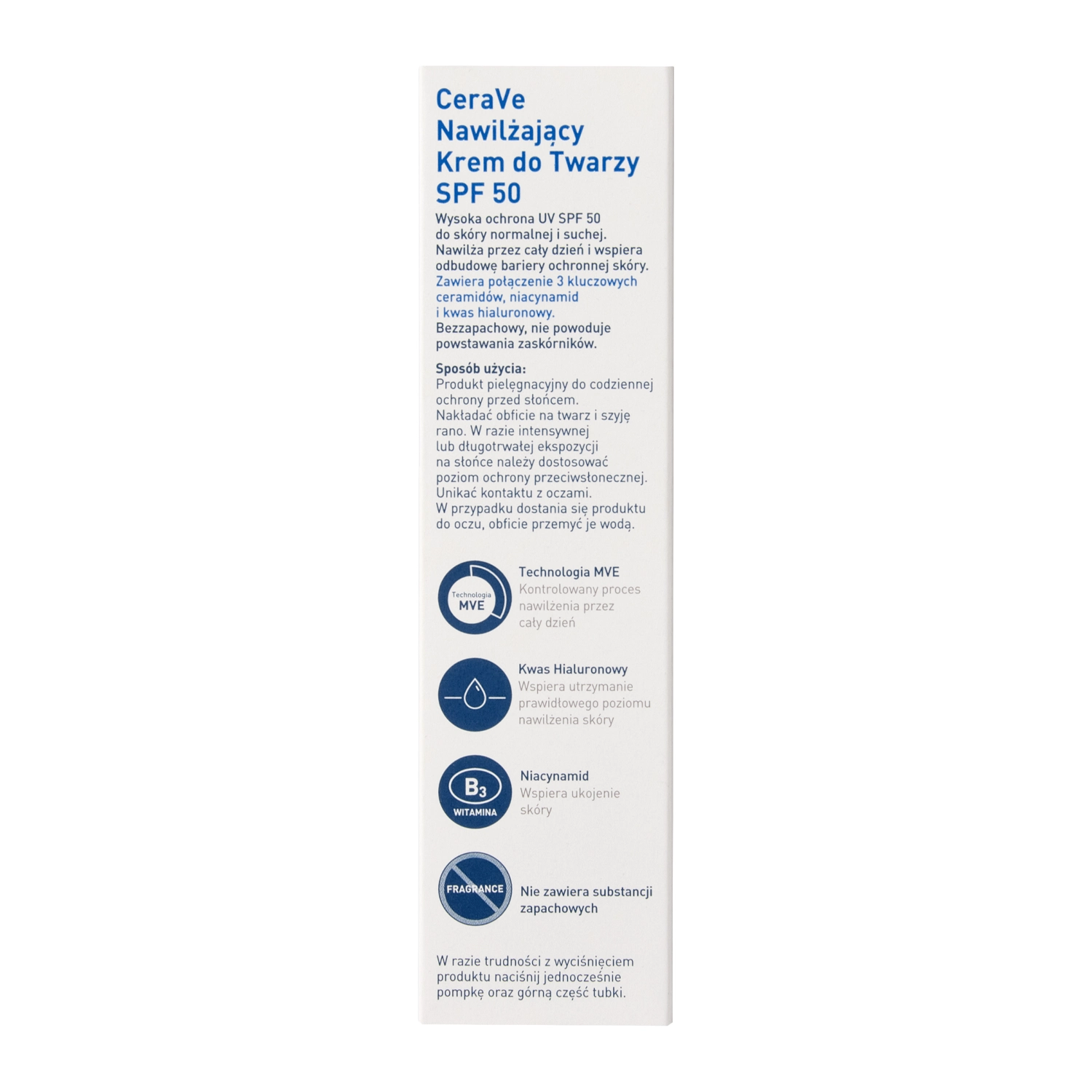 CeraVe - Hidratáló Fényvédő Krém SPF50 - fényvédő arckrém minden bőrtípusra. Kémiai szűrőket tartalmaz, amelyek megvédik a bőrt az UV sugárzástól. Háromféle ceramiddal gazdagították, amelyek erősítik a bőr hidrolipid gátját és védik a bőrt a kiszáradástól. A niacinamid antioxidáns és gyulladáscsökkentő hatást biztosít, melynek köszönhetően hatékonyan csökkenti a bőrpírt és az irritációt, valamint szabályozza a faggyúmirigyek munkáját és kiegyenlíti bőrtónust. Ezenkívül a koleszterin puhítja, kisimítja és tonizálja a felhámot, a nátrium-hialuronát pedig erősen hidratál. A krém védi a bőrt az UV sugárzás negatív hatásaitól, emellett hidratálja és megnyugtatja a bőrt. Illatmentes.