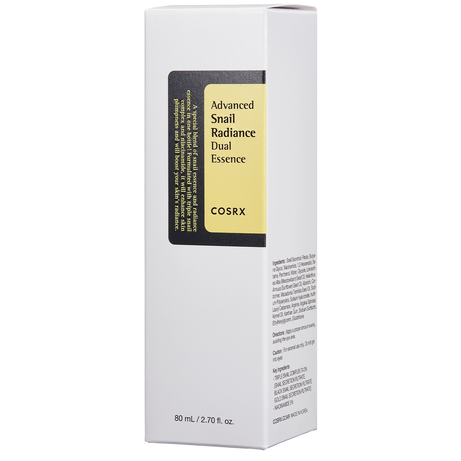 Cosrx - Advanced Snail Radiance Dual Essence - Esszencia, amely csiganyálka szűrletet tartalmaz, amely erősen hidratál, enyhíti az irritációt és felgyorsítja a gyógyulást. A niacinamid elősegíti a gyógyulást és a regenerációt, ránctalanító hatású, a panthenol pedig hidratál, csillapítja az irritációt és a bőrpírt. Tartalmaz továbbá a fehér tájtékvirág magolajat , amely hidratál és puhít, valamint hialuronsavat Nátrium-hialuronát formájában, amely megköti a vizet, hogy a bőr hidratált maradjon.