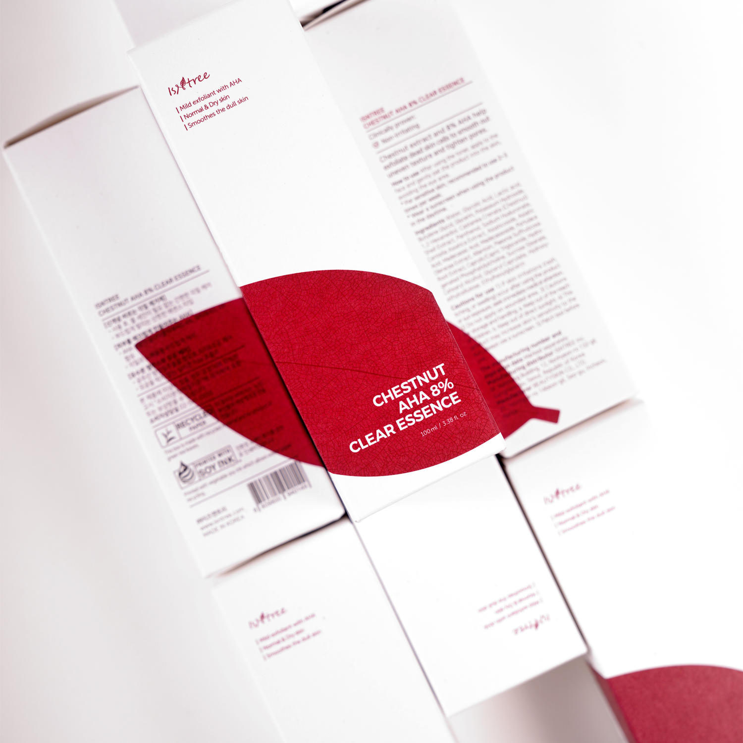Isntree - Chestnut AHA 8% Clear Essence - egy AHA-savak - glikolsav és tejsav - tartalmú esszencia, amely eltávolítja az elhalt hámsejteket, hidratál és szabályozza a faggyúkiválasztást, kellemesen puhává és simává varázsolva a bőrt. Tartalmaz továbbá bőrpír csökkentő gesztenye-kivonatot, hidratáló nátrium-hialuronátot és gyulladáscsökkentő és regeneráló Centella Asiatica kivonatot. Az esszencia felvitele után a bőr láthatóan kisimult, puha és megnyugtatott marad. A termék rendszeres használata javítja a problémás, érdes vagy egyenetlen tónusú bőr megjelenését. A termék pH-értéke 3,5 és 4 között van.
