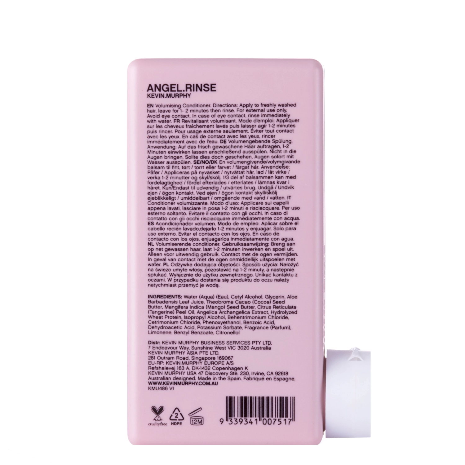 Kevin Murphy - Angel Rinse – dúsító és erősítő kondicionáló festés és fodrászati kezelések által károsodott hajra. Tartalmaz mangóvajat, amely rugalmassá teszi a hajat, valamint kakaóvajat, amely megvédi a nedvességvesztéstől és a külső hatásoktól. Az aloe vera lé hidratálja a hajat és nyugtatja a fejbőrt. A hidrolizált búzaprotein regeneráló hatású, továbbá csökkenti a haj statikusságát. A haj puhává válik, és nő a volumene.