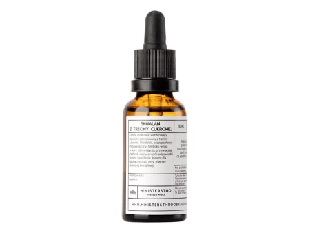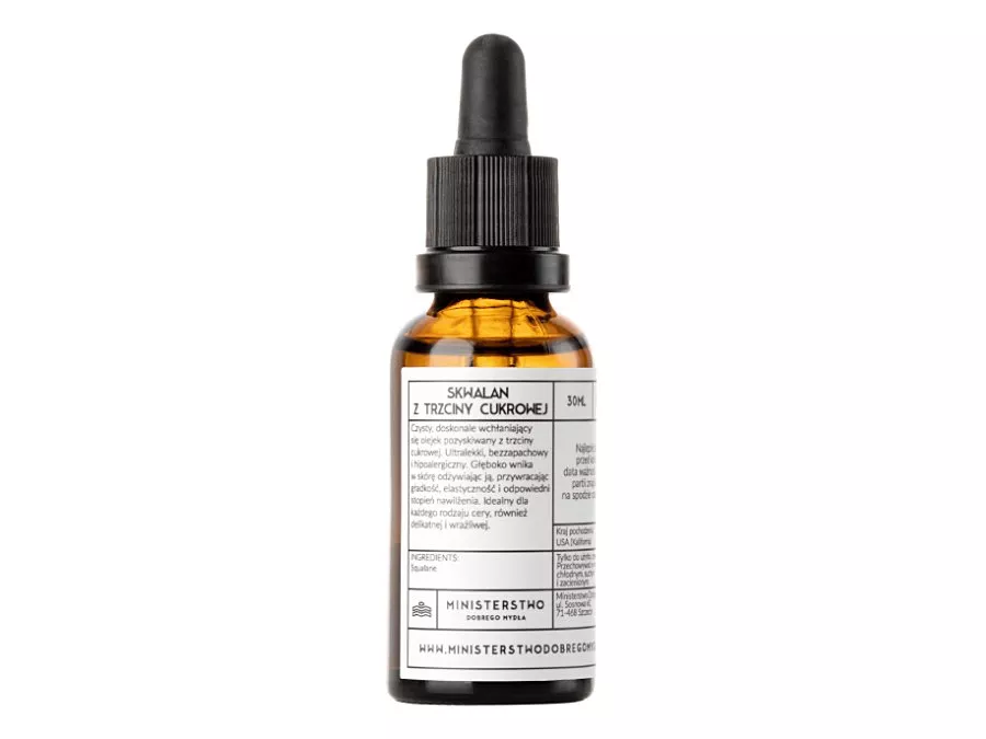 Ministerstwo Dobrego Mydła - Cukornád Szkvalán - Természetes, 100%-ban cukornádból kivont szkvalán. A szkvalán a szkvalén stabil kémiai formája, amely regenerálja a bőrt, enyhíti az irritációt és enyhülést hoz a száraz és repedezett bőrre. Növeli a hatóanyagok penetrációját és lassítja a bőr öregedési folyamatát. Táplálja a bőrt, megakadályozza a felhám vízveszteségét, és megfelelő hidratáltsági szintet biztosít a bőrnek, miközben nem nincs komedogén hatása. A termék minden bőrtípus ápolására ajánlott.
