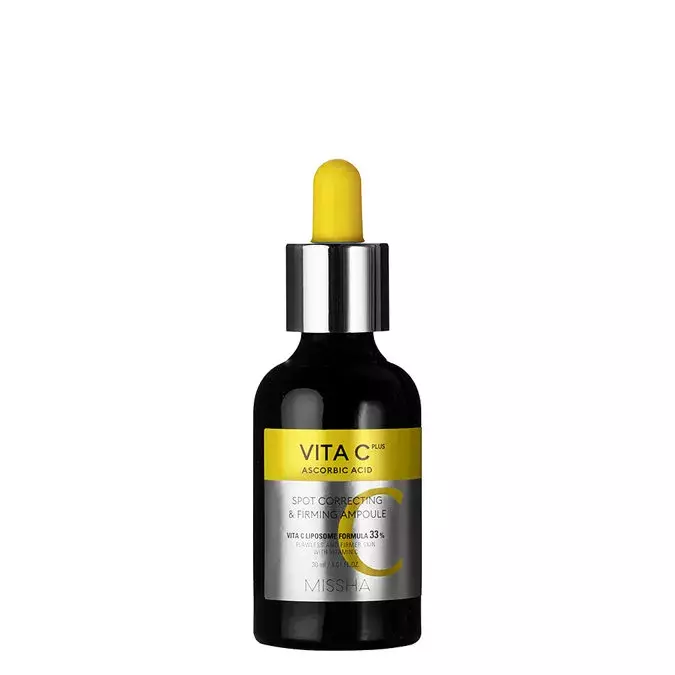 Missha - Vita C Plus Spot Correcting & Firming Ampule - intenzíven világosító szérum, amely gyulladáscsökkentő édesgyökér kivonaton alapul. Hatékonyan világosítja a bőrt a C-vitamin és a homoktövis-hidrolátum révén, amely ennek a vitaminnak a természetes forrása. A tranexámsav szintén erősen világosító összetevő. A niacinamid egyenletes bőrtónust biztosít. A szérum a hiperpigmentáció világosítása mellett, amely minden életkorban megjelenhet a bőrön, a ceramid NP, a peptidek, az adenozin és más antioxidánsok tartalmának köszönhetően érett bőrre is alkalmas.