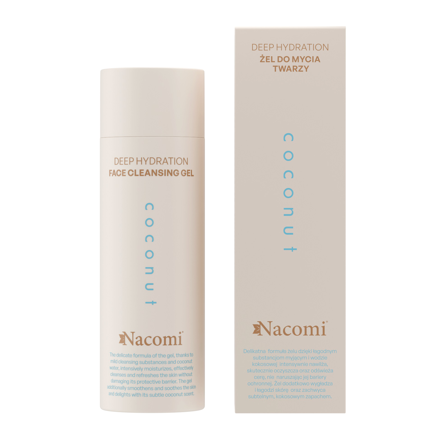 Nacomi - Deep Hydration - Coconut - gyengéd tisztítóanyagokat tartalmazó arclemosó gél, amely alaposan tisztítja a bőrt az irritáció veszélye nélkül. Összetételében megtalálható a kókuszkivonat, amely növeli a bőr hidratáltsági szintjét, táplálja azt és ragyogást kölcsönöz neki, valamint a panthenol, amely rugalmasabbá teszi a bőrt, enyhíti az esetleges irritációt és elősegíti a regenerációt. Ezenkívül a lecitin a hidratálásért és a bőrgát megerősítéséért felelős. A prebiotikum viszont nyugtatja a bőrt, megakadályozza a korai öregedést és gyulladáscsökkentő hatású, míg az E-vitamin, amely erős antioxidáns, erősíti a felhámot, megakadályozza az irritációt és gátolja a víz távozását a bőrből.