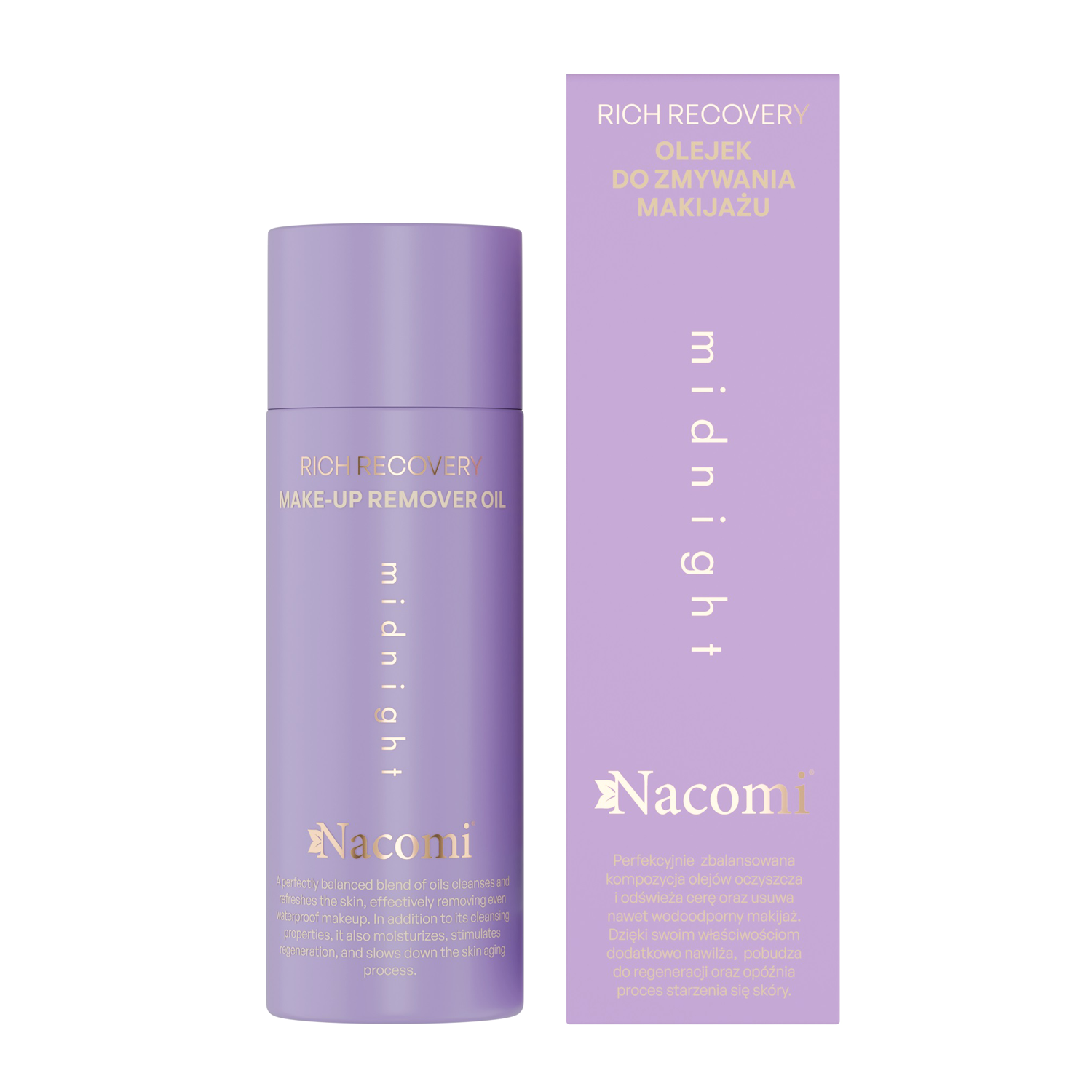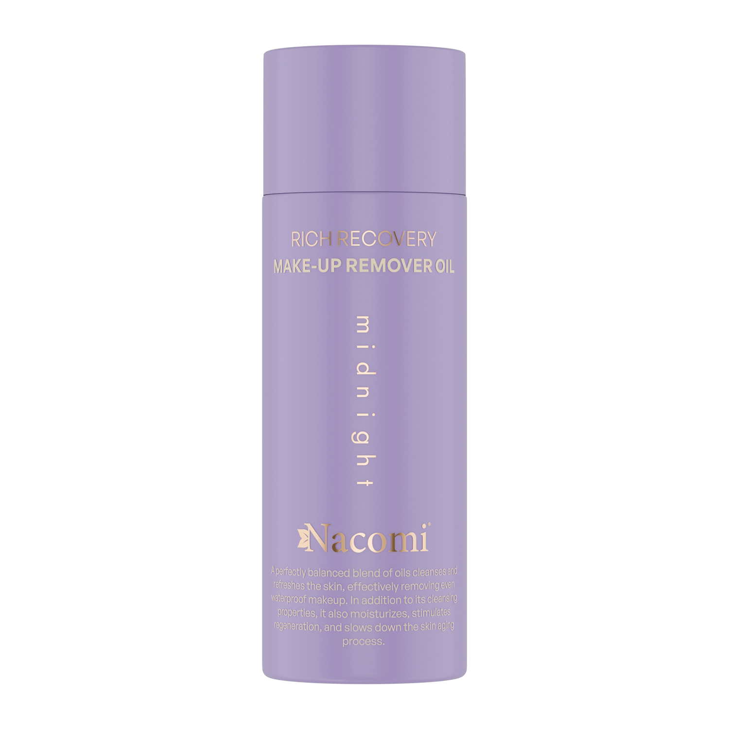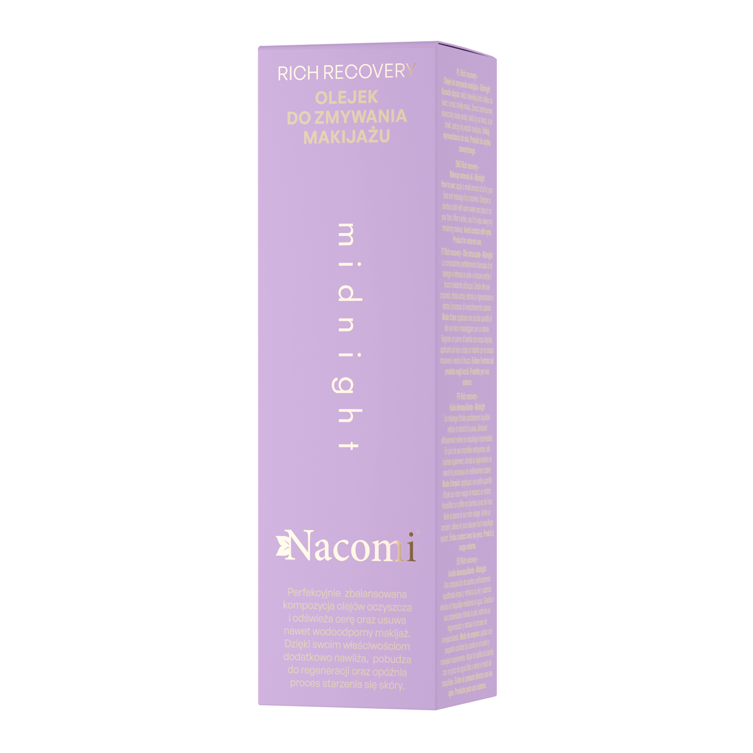 Nacomi - Rich Recovery - Midnight - sminklemosó olaj. Hatékonyan tisztítja a bőrt anélkül, hogy irritációt okozna. Édesmandulaolajat és olívaolajat tartalmaz, amelyek megtartják a vizet a felhámban, és simító és kenő hatásúak. A jázminvirág kivonat simává, puhává teszi a bőrt és hidratálja az epidermiszt, a rózsaolaj pedig antibakteriális és gyulladáscsökkentő tulajdonságokkal rendelkezik. Az E-vitamin, amely antioxidáns, lassítja a bőröregedési folyamatot és védi a bőr vízveszteségtől. Az olaj használata után a bőr feszes, hidratált és sima marad.