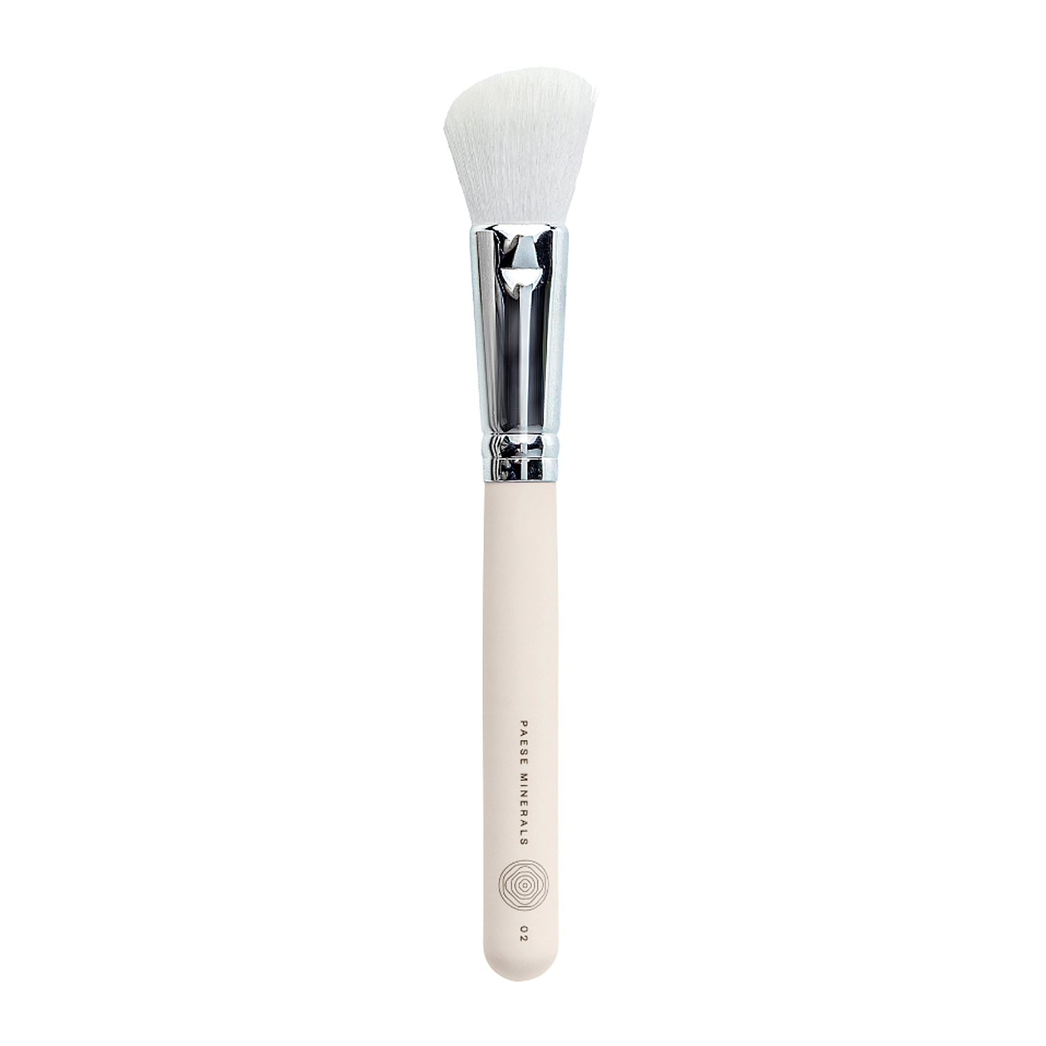 Paese - Minerals - 02-es Ecset Púderes Pirosító, Bronzosító és Highlighter Felviteléhez - enyhén ferde ecset az ásványi arckontúrozó termékek száraz és nedves felviteléhez. Formájának és sörtéinek sűrűségének köszönhetően csíkozás nélkül oszlatja el a kozmetikumokat a bőrön. Kézzel készült, műszálas sörtékkel, fa nyéllel és fém kupakkal. Nagyon tartós és ellenálló a sérülésekkel szemben.
