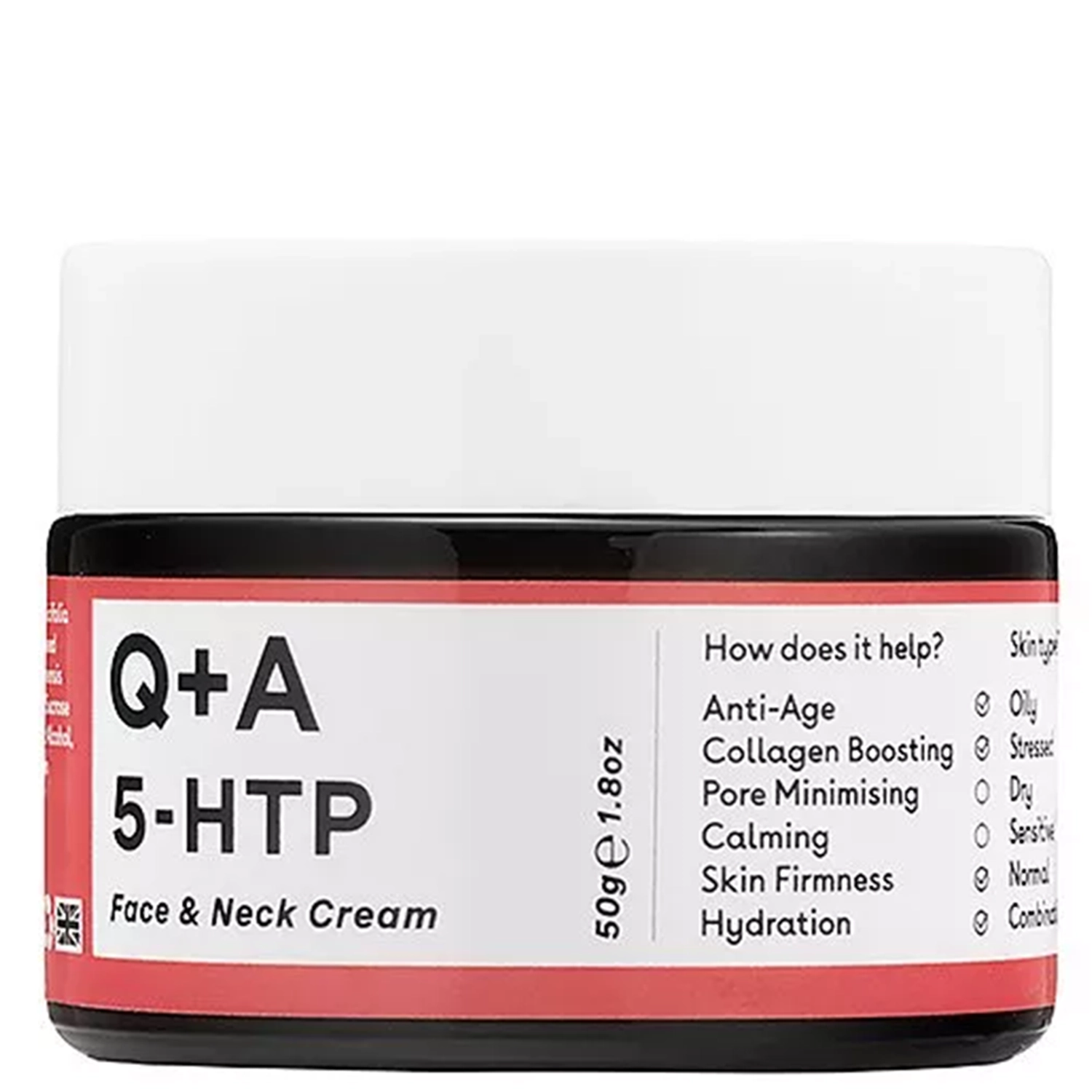 Q+A - 5-HTP - Face&Neck Cream - Az anti-aging ápolásra tervezett arckrém minden bőrtípusra. Afrikai fekete babmag kivonat és kaffein javítja a bőr rugalmasságát és feszességét. A koffein csökkenti a puffadtságot, így remekül illik a reggeli bőrápolási rutinhoz. A napraforgóolaj tökéletesen hidratálja a bőrt, az E-vitamin pedig antioxidáns, amely lassítja a bőr öregedési folyamatát.