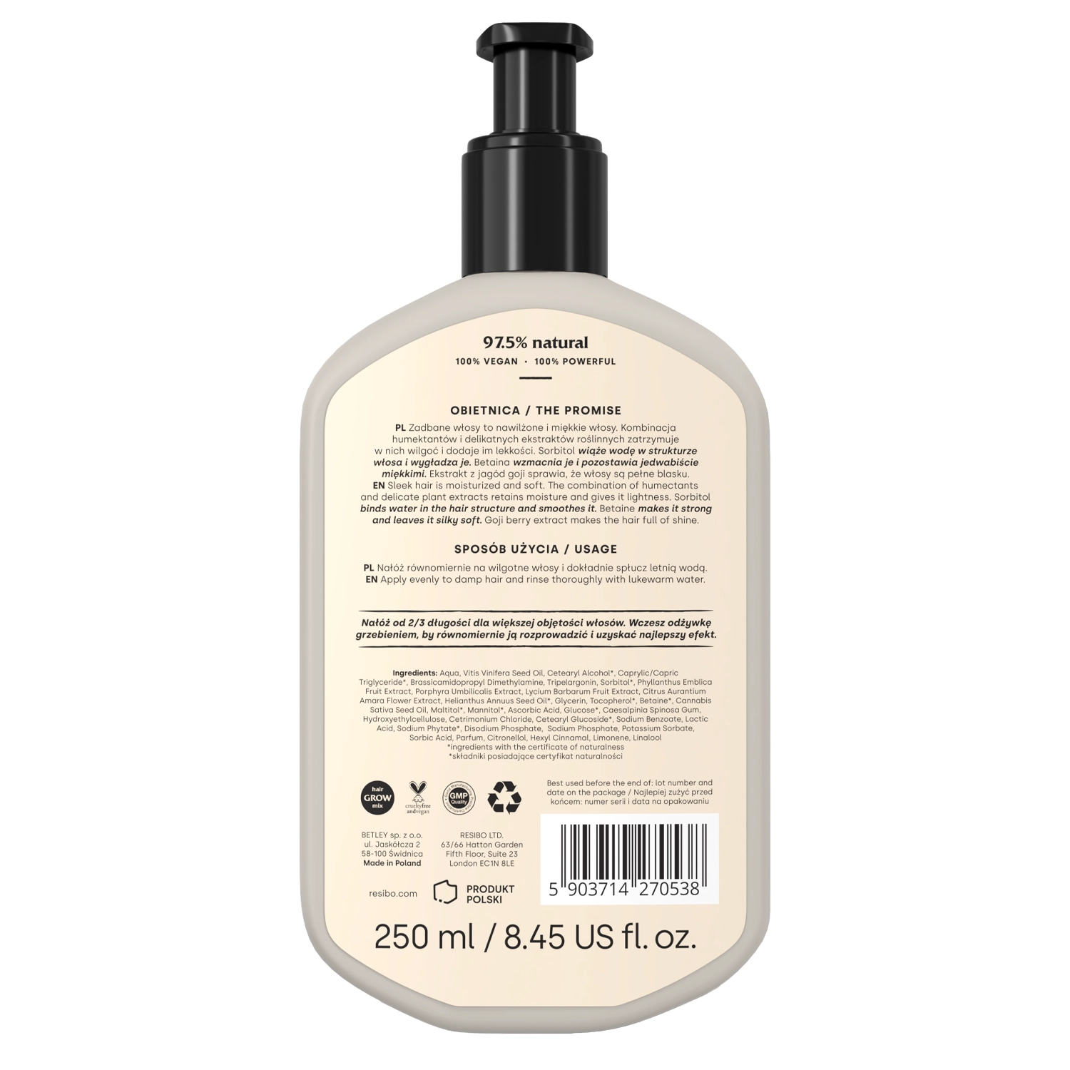 Resibo - Waterlight - Hidratáló hajápoló - Többek között nedvesítőszerek és növényi kivonatok kombinációját tartalmazza, amelyek hidratálják a hajat. A szorbit megköti a vizet a haj szerkezetében és kisimítja, míg a glükóz és a maltit hidratál, emellett megakadályozza a hajvégek töredezését. Ezen kívül a készítmény amla kivonatot is tartalmaz, amely erősíti a hajhagymákat, így megelőzi a hajhullást és egyben serkenti azok növekedését. Másrészt a kenderolaj védi a szálakat a külső tényezőktől, táplál és erősít, a betain pedig hidratál és megakadályozza a statikus elektromosságot. A goji bogyó kivonat hozzáadása fényessé teszi a hajat. A kondicionáló friss, citrusos illatú. Összetétele vegán és 97,5%-ban természetes.