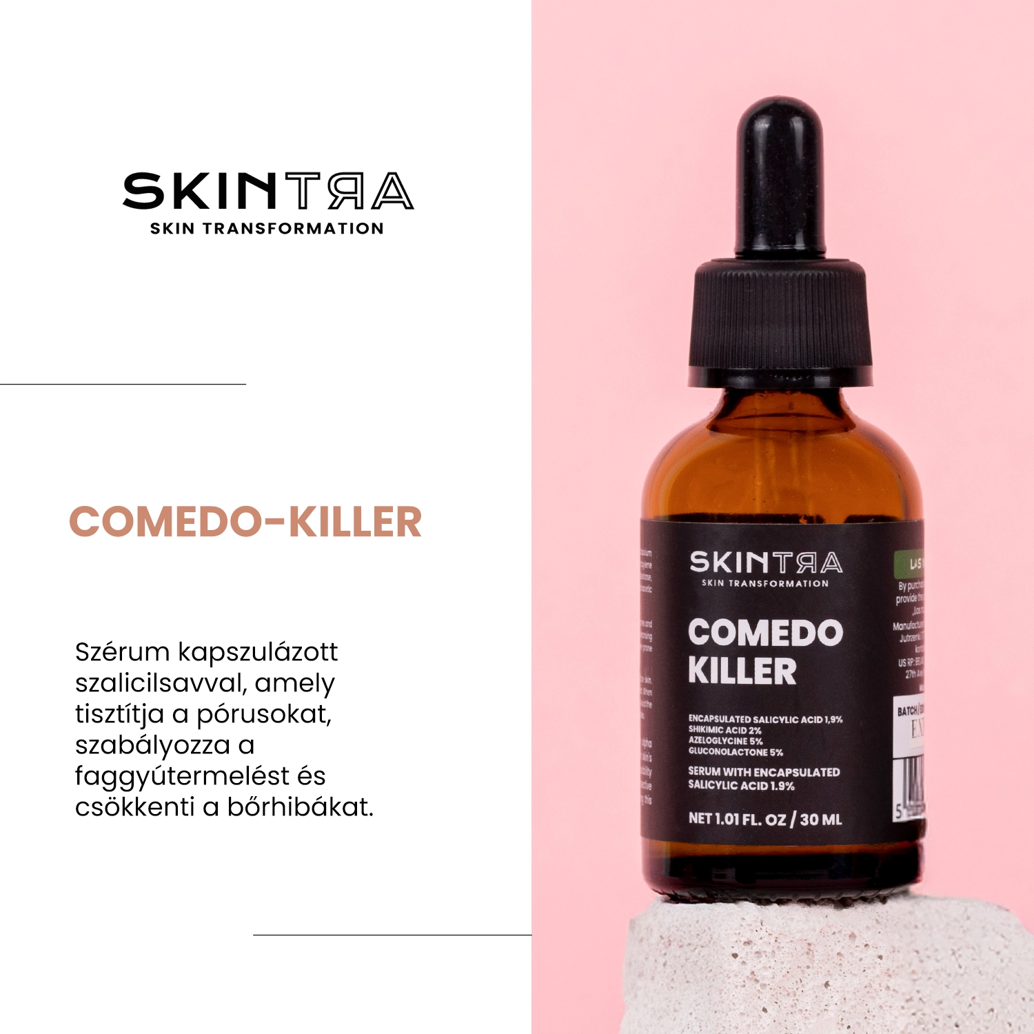 SkinTra - Comedo-killer - vizes, könnyed állagú tisztító savas szérum. A szalicilsav hatékonyságát ötvözi kíméletes összetétellel, a sav kapszulázásának és lassú felszabadulásának köszönhetően. A kapszulázott szalicilsav 2%-os koncentrációban optimális hatékonyságot biztosít, miközben kíméletes marad a bőrhöz, és fokozatosan szabadul fel, miközben hosszabb időn keresztül biztosítja az aktív hatást. Gyengéd hámlasztással tisztítja az arcbőrt, eltávolítja az elhalt hámsejteket és a szennyeződéseket. Hatékony a mitesszerekkel és a túlzott faggyútermeléssel kapcsolatos problémák esetén, antibakteriális tulajdonságainak köszönhetően pedig megakadályozza a pattanások kialakulását. Ezenkívül jó olajoldékonyságának köszönhetően hatékonyan tisztítja a faggyúmirigyeket. A szérum formuláját olyan összetevőkkel gazdagítottuk, amelyek támogatják a szérum fő hatását. Az azeloglicin a glükonolaktonnal és a shikimisavval együtt szabályozza a bőr működését, csökkentik és megelőzik a tökéletlenségeket. A nem komedogén, alkoholmentes formula könnyűség érzetet nyújt, és teljesen szívódik fel. A termék minden bőrtípusra alkalmas, beleértve a zsíros, érzékeny vagy mitesszeres bőrt is. A szérum nem mutat fototoxikus vagy fotoallergén hatást. A maximális kényelem érdekében bőrbarát, 4,5 körüli pH-értéket alkalmaztunk, így a Comedo-killer gyengéd, így nem okoz égő érzést az alkalmazás után.
