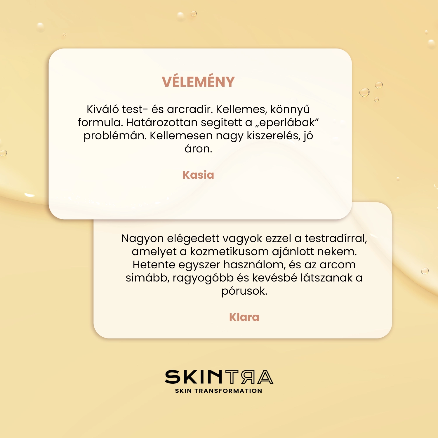 A SkinTra - Destructor - Egész évben használható, otthoni arcápolásra tervezett savas hámlasztó. Az összetevői közé a mandulasav, kojinsav, tranexámsav, azeloglicin és C-vitamin tartozik. A savak magas koncentrációja (24%) felelős a bőr erős hámlásáért, kisimításáért és ragyogásáért, valamint a tirozináz enzim gátlásáért. Az utolsónak köszönhetően csökkenti a melanin szintézisét, így véd az újabb elszíneződések kialakulásától. Ha a bőröd egyenetlen tónusú, fakó, matt, mitesszeres és pattanásos, akkor máris megvan a MUST HAVE-d! Ez a termék meglephet téged. Már az első használat után látható eredményeket biztosít, mintha szépségszalonból jönnél ki. A termék nem mutat fotótoxikus vagy fényérzékenyítő potenciált, pH-ja 2,7.