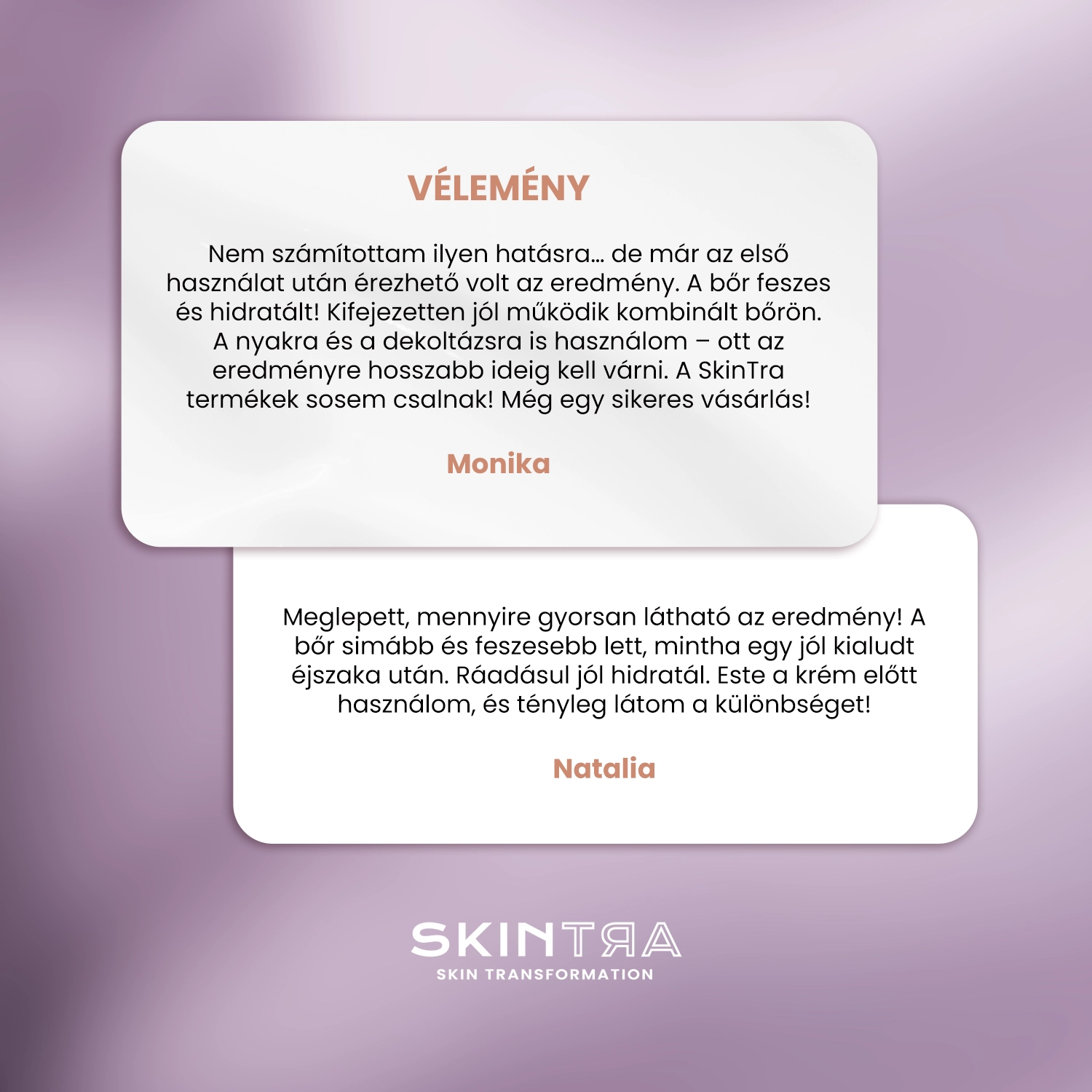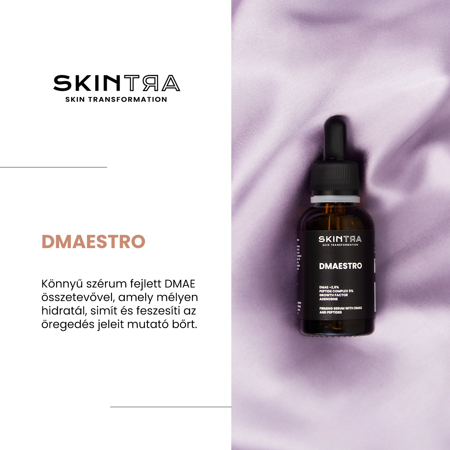 SkinTra - Dmaestro - egy könnyű arcszérum, amely hidratáló, simító, feszesítő és rugalmasító hatást biztosít az öregedő bőrnek. Gélszerű állaga van, amely közvetlenül a felvitel után enyhe ragacsosságot és feszülést okozhat, de pár percen belül észrevehető réteg nélkül felszívódik. A feszülő érzést nem a bőr szárazsága, hanem az ezt az érzést keltő összetevők okozzák. A termék használható az arcon, a nyakon, a dekoltázson és a kezeken, valamint a szem körül. Hatását az izomösszehúzódást serkentő összetevőnek - 2,5% DMAE-nak - köszönheti, melynek eredménye a ráncok megjelenésének csökkenése és a bőr feszességének javulása. Az alkalmazott peptidkomplex egy növekedési faktorral együtt elősegíti az I-es típusú kollagén szintézisét és a sejtek közötti cementfehérjék megvastagodását, ami az érett bőr szerkezetének kisimulásához és feszesítéséhez vezet. A készítményt a mezei katáng oligoszacharid és az adenozin teszi teljessé. Ezek együttesen feszesítik a bőrt és létre hoznak egy okkluzív réteget a felszínén, valamint minimalizálják a gyulladást és serkentik a regenerációt az elasztin fokozott termelése révén. A szérum nem pereg le, és jól mutat a smink alatt. Reggel és este, egész évben használható. A DMAE összetevő 6 hónapos használat után fejti ki teljes hatását. A száraz bőr esetén azonban javasoljuk, hogy 10-15 perccel a szérum felvitele után krémezd be az arcod, hogy extra védőréteget hozz létre a bőrfelületen. A termék vegánok és vegetáriánusok számára is alkalmas.