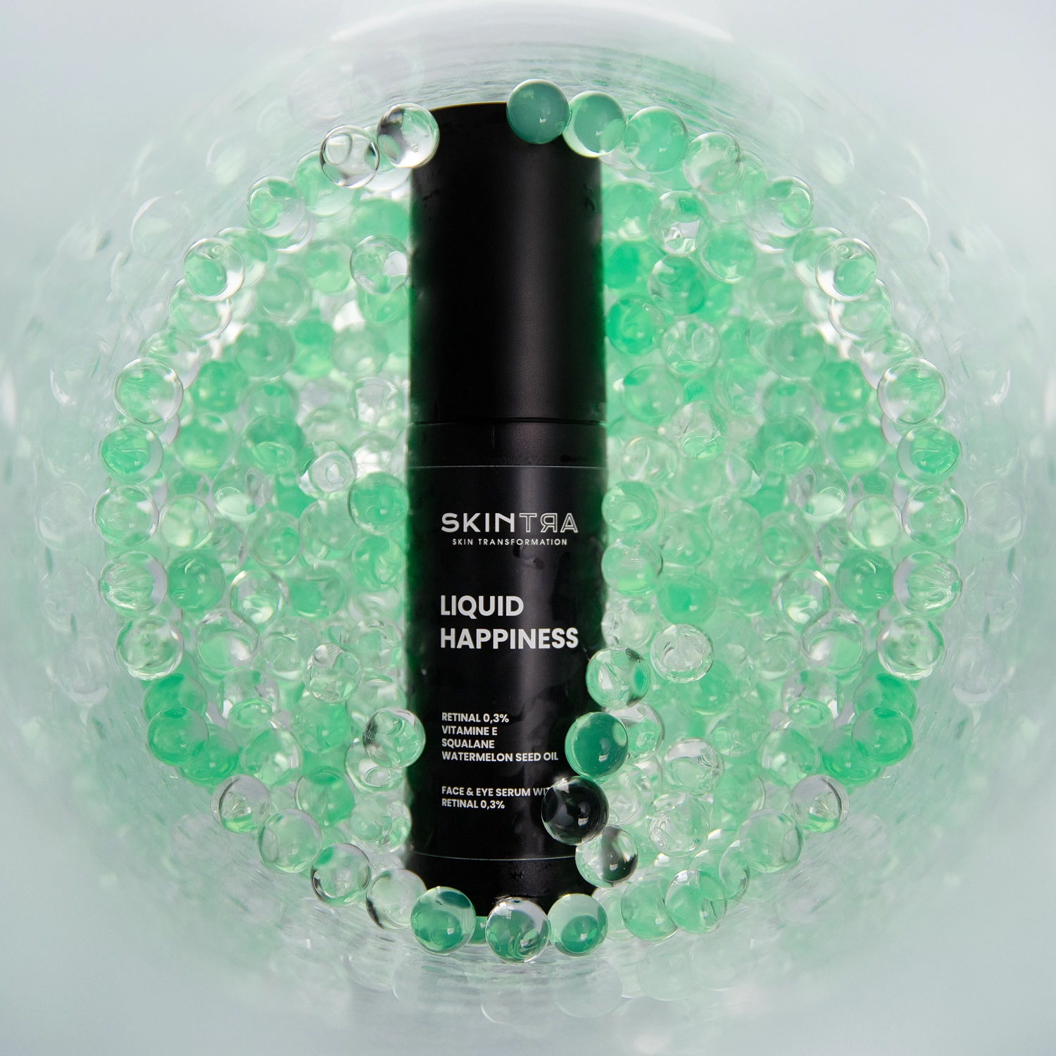 SkinTra - Liquid Happiness - A kozmetikai piacon elérhető legaktívabb retinsav-származékot tartalmazó szérum, azaz retinalt, amely a retinolnál több mint 11-szer erősebb aktivitást mutat. A termék olaj alapú formula, de a szkvalán és dinnyemagolaj használatának köszönhetően gyorsan felszívódik, és nem hagy kellemetlen, zsíros réteget. Minden bőrtípusra tervezték. Használati javallatok: ráncok, feszesség és rugalmasság elvesztése, tökéletlenségek és hiperpigmentáció. A terméket nem szabad terhesség és szaptatás alatt használni. A formulája vegán. A kozmetikum hűvös, árnyékos helyen, lehetőleg hűtőben tárolandó.