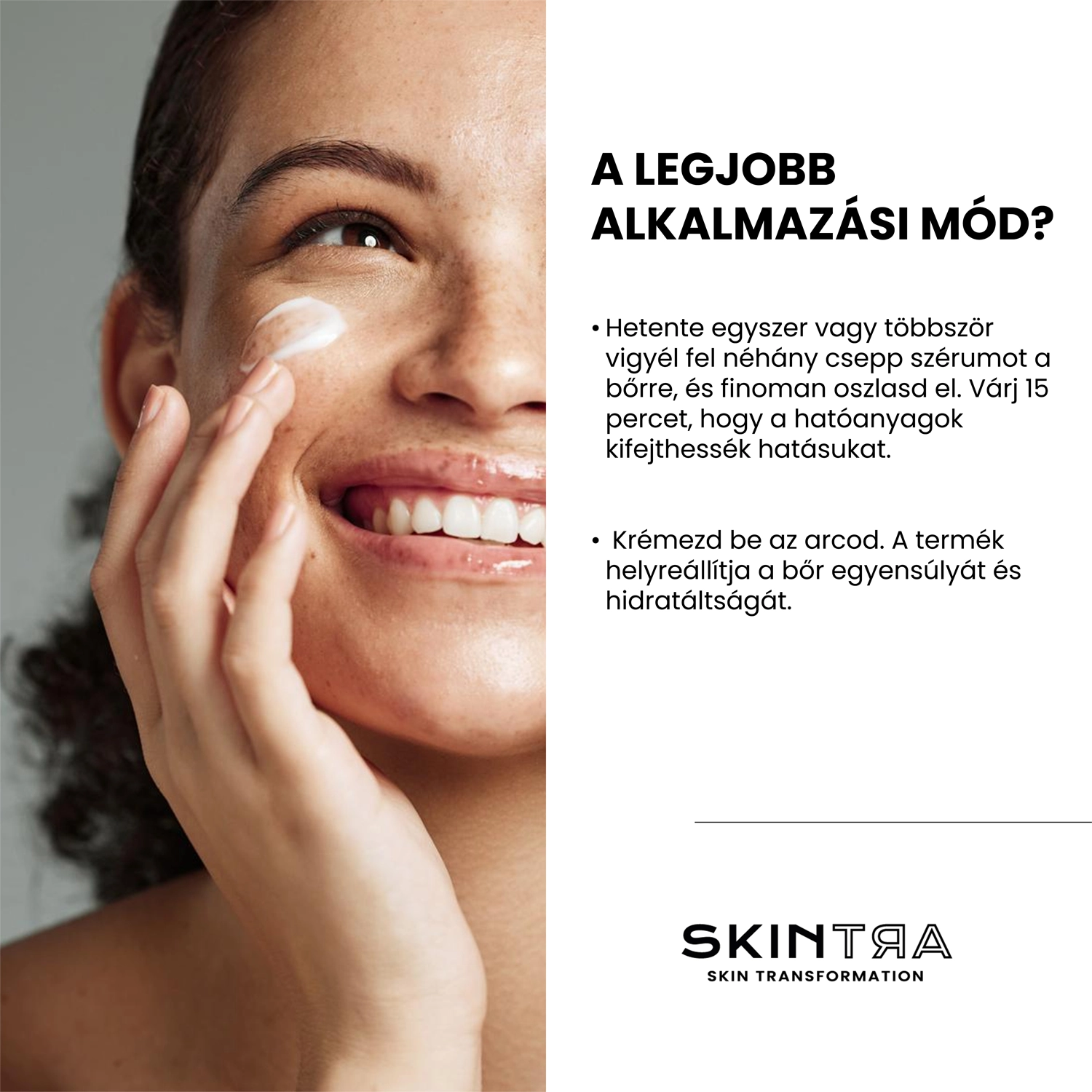 - SkinTra - Mr. Smoother – vigyél fel néhány csepp szérumot a tiszta, teljesen száraz bőrre, majd finoman oszlasd el. Felszívódás után opcionálisan krémezheted be az arcod. Alkalmazd este. Javasoljuk, hogy a savas szérum használata után várj 10-15 percet, majd alkalmazz hidratáló krémet. A használat gyakoriságát igazítsd bőrtípusodhoz és igényeidhez.