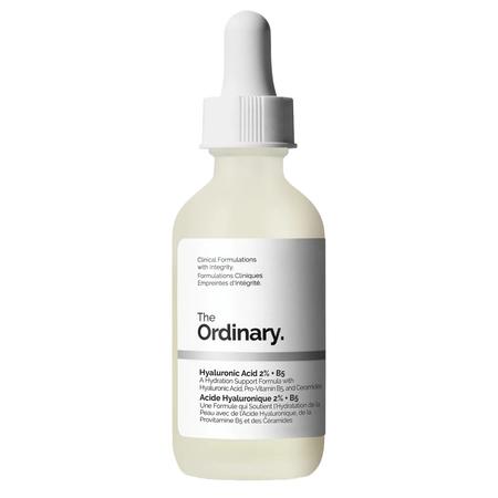 The Ordinary - Hyaluronsav 2% + B5 - Víz alapú készítmény, amely alacsony, közepes és magas molekulatömegű hialuronsavat és egy fejlett hialuronsavval térhálósított polimert kombinál. A bőr hidratáltságának növelésére alakították ki. Megelőzi a ráncok és a bőrszerkezet tökéletlenségeinek megjelenését. A készítményben lévő B5-provitamin javítja a hidratáltságot, simít és növeli a bőr feszességét. Az Ahnfeltia Concinna algakivonat elősegíti a felhám regenerálódását és rugalmasabbá teszi a bőrt, az E-vitamin pedig erős és hatékony antioxidánsként gátolja a bőröregedési folyamatokat. Az újdonság a szfingolipidek néven ismert ceramidok felhasználása, amelyek támogatják a bőr barriert, hogy megőrizzék a nedvességtartalmat a bőrben. A szérum nagyon gyorsan felszívódik anélkül, hogy ragacsos réteget hagyna a bőrön. A kozmetikum pH-értéke 6,50-7,50 között mozog.