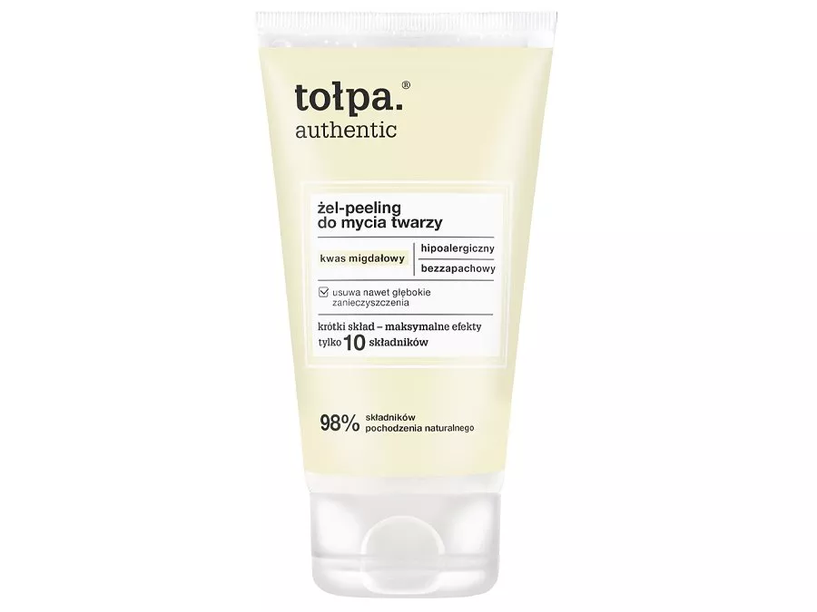Tołpa - Authentic - Arctisztító Gél-Peeling - tisztít és egyszerre intenzíven ápoljá a bőrt az mandulasav tartalmának köszönhetően. Eltávolítja a keratinizált hámréteget és a legfinomabb szennyeződéseket, miközben megőrzi a mikrobiom természetes egyensúlyát, a fiziológiás pH-ját és a hidrolipid barriert. A bőr megtisztul, kisimul és hidratált marad.