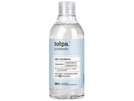 Tołpa - Authentic - Micellás Víz - A termék tisztít és egyszerre intenzíven kondicionál, a hozzáadott niacinamidnak köszönhetően. Eltávolítja a legapróbb szennyeződéseket és a sminket, miközben megőrzi a mikrobiom természetes egyensúlyát, a fiziológiai pH-t és a hidrolipid barriert.