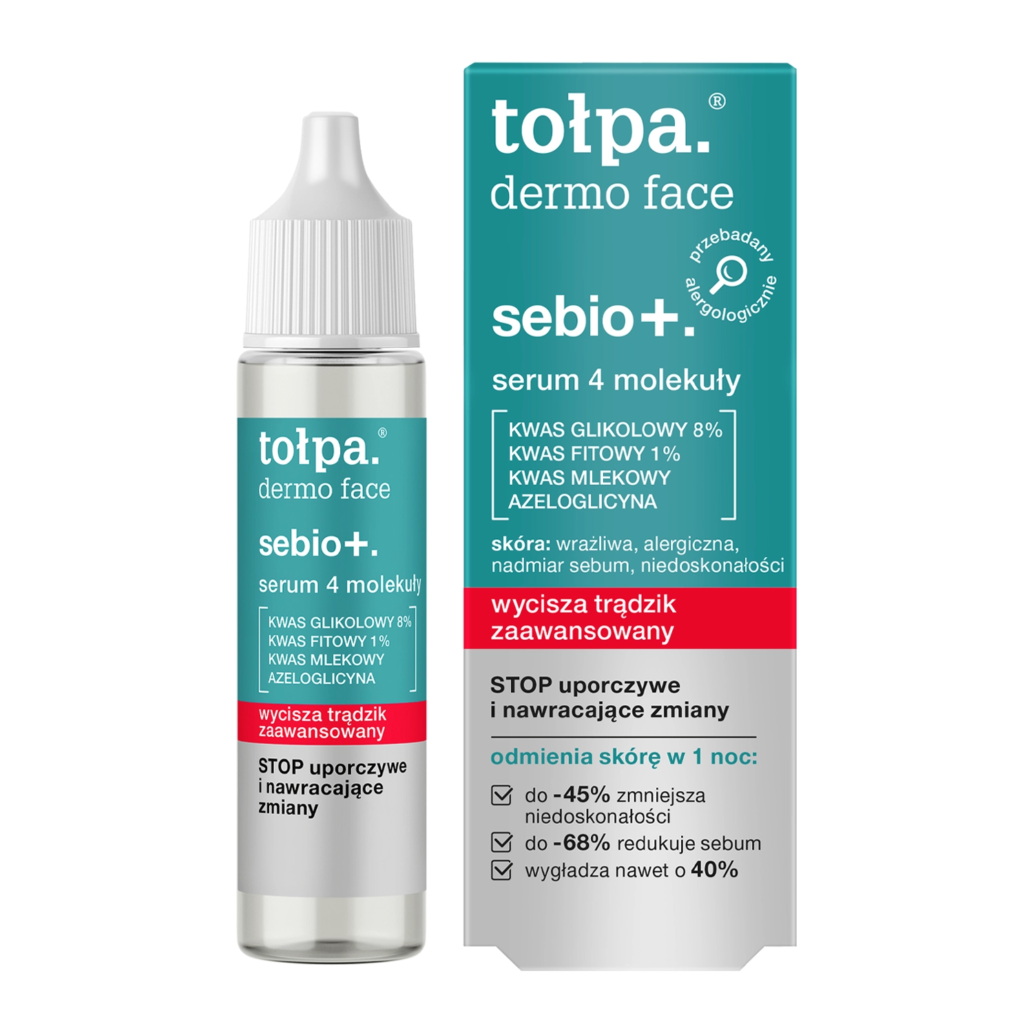 Tołpa - Dermo Face Sebio+ - 4 Molekula Serum - a termék csökkenti a tökéletlenségeket és segít a hiperpigmentáció elleni küzdelemben. 8%-os glikolsavat tartalmaz, amely hámlasztó, szeboreguláló és világosító hatású. A fitinsav viszont lassítja a bőröregedési folyamatot, javítja a hidratáltsági szintet, hatékonyan világosítja a hiperpigmentációt és megakadályozza az új pigmentfoltok kialakulását. A tejsav puhítja és mélyen hidratálja a bőrt. A hozzáadott azeloglicin gyulladáscsökkentő és világosító hatású, valamint gyorsítja a bőrregenerációt.