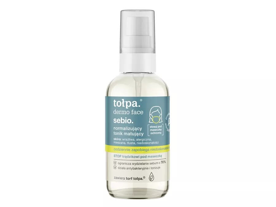 Tołpa - Dermo Face Sebio - egy normalizáló tonik, amely Tolpa® tőzeget - egy több növényből álló antioxidánst tartalmaz, amely védi és erősíti az érzékeny bőrt. A termék számos antibakteriális anyagot is tartalmaz, például cink-szulfát vagy mirha-kivonat. Ezen kívül a bojtorján-kivonat szabályozza a faggyúkiválasztás.