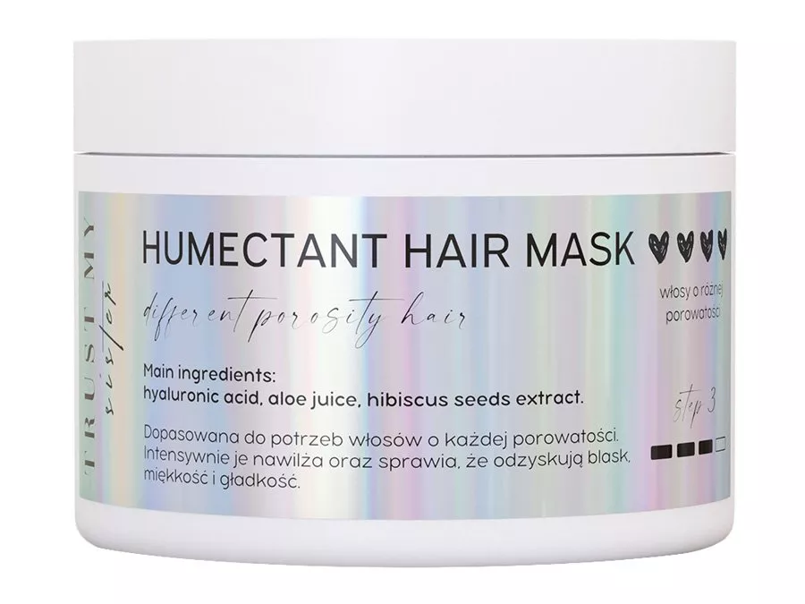 Trust My Sister - Humectant Hair Mask - egy hidratáló maszk minden porozitású hajra. Aloe vera levet és panthenolt tartalmaz, amelyek intenzíven hidratálják a száraz hajat. A babassu olaj védőfilmet képez a haj felszínén, amely megtartja a nedvességet, simítja és rugalmasabbá teszi őkt. Emellet a hibiszkusz-kivonat regenerálja és védi a hajat, a lenmag-kivonat puhítja azt, a hidrolizált rizsfehérjék pedig csökkentik a statikusságot és feltöltik a hajat. A maszk hidratálja, puhítja és táplálja a hajat, lazává és ellenállóbbá teszi azt a sérülésekkel szemben.